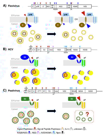 In general, with some exceptions, Flaviviridae virus-encoded proteases carry out the NS protein processing and host signal peptidase (SPase) cleaves most of the structural protein junction sites (Figure 1). In principle, SPase-mediated cleavage is expected to occur in a rapid, co-translational manner [,]. However, among the three SPase-dependent cleavage sites within the C–prM–E–NS1 region of flavivirus, C–prM cleavage is delayed [,,] (Figure 1A). Likewise, among the four SPase target sites within the C–E1–E2–p7–NS2 region of HCV (hepacivirus), E2–p7 and, to a lesser extent, p7–NS2 processings are delayed and/or incomplete [,,] (Figure 1B). In the case of pestivirus, among five SPase target sites within the C–Erns–E1–E2–p7–NS2 region, Erns–E1 and E2–p7 processing are delayed and/or incomplete [,,] (Figure 1C). Recent studies indicate that altering the SPase-mediated processing efficiency at these “delayed” cleavage sites reduced virus assembly and/or release, suggesting that maintaining the “optimal inefficiency” of SPase-mediated cleavage at these sites is essential for viral propagation [,,,,,,]. By discussing recent progress, this review aims to provide insight on how different viruses within the Flaviviridae family differentially regulate the host SPase-mediated cleavage at specific junction site(s) within viral structural protein precursors and how the calculated regulation of SPase processing at these sites contributes to their efficient propagation.