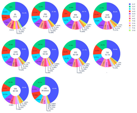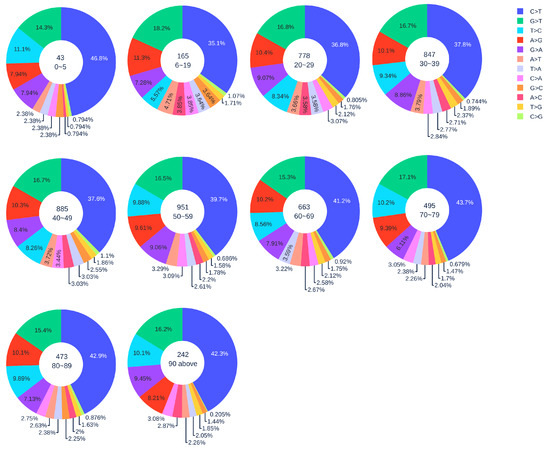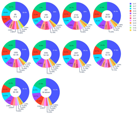 The distribution of 12 SNP types among unique mutations in the SARS-CoV-2 genome isolates from different age groups. The text inside each circle represents the total number of records that have age information for different age groups.