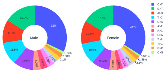 The distribution of 12 SNP types among unique mutations in the SARS-CoV-2 genome isolates from two gender groups. The total number of records in the female group is 5762 and the total number of records in the male group is 7012.