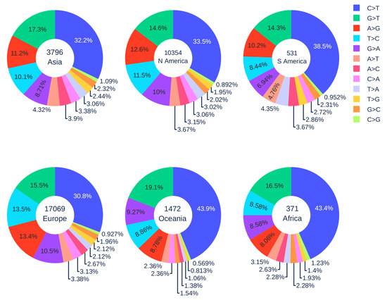 The distribution of 12 SNP types among unique mutations in the SARS-CoV-2 genome isolates in six continents. The text inside each circle represents the total number of records in each continent.