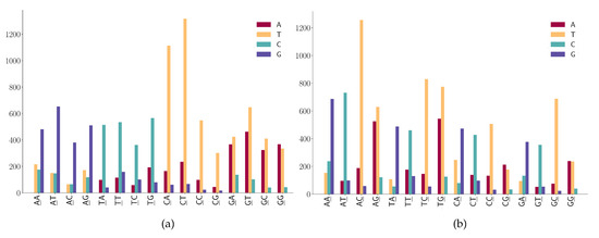 SNP frequencies on 2-mer motifs. (a) SNP frequencies are at the first position of 2-mer motifs. (b) SNP frequencies are at the second position of 2-mer motifs.