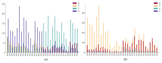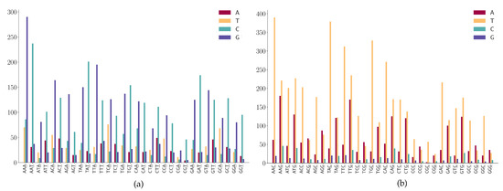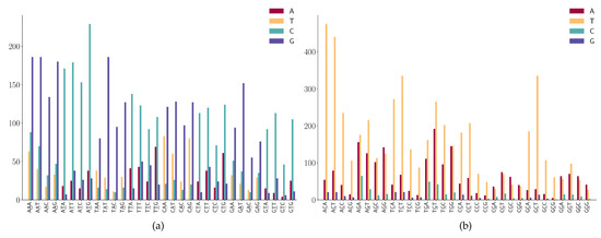 SNP frequency at the third position of the 3-mer motifs. (a) A or T is at the third position of 3-mer motifs. (b) C or G is at the third position of 3-mer motifs.