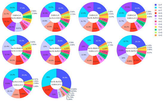 It is reasonable to assume that the five coronaviruses, SARS-CoV (2003) [43], Bat-SL-BM48-31 (2008) [44], Bat-SL-CoVZC45 (2017) [45], Bat-SL-RaTG13 (2013) [46] and SARS-CoV-2 (2019) [2], are of the same origin but differ from each other by their evolutionary stages. The data collection date of Bat-SL-RaTG13 (2013) was denoted as 24 July 2013, while the data were not uploaded to the GISIAD database until 27 January 2020. Figure 10 shows the mutation ratio among these five genomes. First, similar to the SARS-CoV-2 mutations listed in Table 1, four transition types (i.e., A > C, C > A, C > T, and T > C) still have high mutation ratios. Notably, the C > T type has the highest ratio, indicating that host immune response still plays the major role. However, transversion type G > T is not as important as in the SARS-CoV-2 mutations discussed earlier. Nonetheless, transversion types A > T and T > A appear on the top six mutation types.