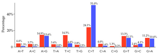 Comparison of the ratios of 12 SNP types among unique mutations (red) and non-unique mutations (blue) in SARS-CoV-2 genomes globally. Here, if we count the same mutation that appears in different SARS-CoV-2 isolates only once, we call those mutations unique mutations. If we count the same mutation in different SARS-CoV-2 isolates repeatedly according to their frequency, then all of the mutations that are detected in the complete SARS-CoV-2 genome sequences are called non-unique mutations.