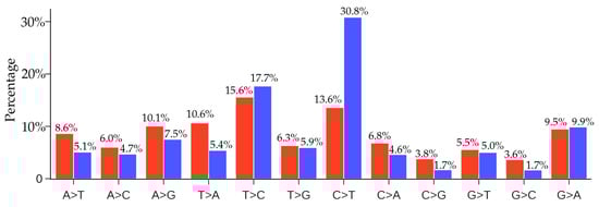 Comparison of the ratios of 12 SNP types among unique mutations (red) and non-unique mutations (blue) in MERS-CoV genome isolates. Here, if we count the same mutation that appears in different MERS-CoV isolates only once, we call those mutations unique mutations. If we count the same mutation in different MERS-CoV isolates repeatedly according to their frequency, then all of the mutations that are detected in the complete MERS-CoV genome sequences are called the non-unique mutations.