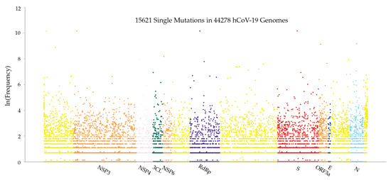 Genome-wide SARS-CoV-2 mutation distribution. The y-axis represents the natural log frequency for each mutation on a specific position of the complete SARS-CoV-2 genome. While only a few landmark positions are labeled with gene (protein) names, the relative positions of other genes (proteins) can be inferred from Table 5.