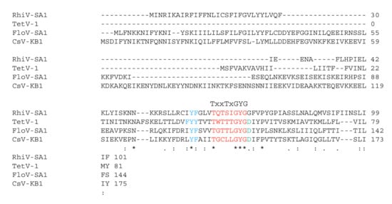 Multiple sequence alignment of putative K+ channels from viruses RhiV-SA1, TetV-1, FloV-SA-1, and CsV-KB1. The consensus sequence of K+ channels (on top) is highlighted in red. The residues in blue indicate functionally important aromatic amino acids in K+ channels upstream of the consensus motif. In the alignment, identical amino acids are indicated by “*” and conserved (amino acids with similar characteristics) and semi-conserved (amino acids having similar shape) amino acids are indicated by “:” and “.”, respectively.