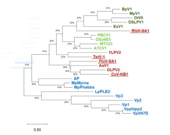 - Sandaa, R.-A.; Dahle, H.; Brussaard, C.P.D.; Ogata, H.; Blanc-Mathieu, R. Algal viruses belonging to a subgroup within the Mimiviridae family. Ref. Modul. Life Sci. 2020. [Google Scholar] [CrossRef]
