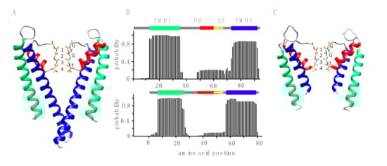 - Shealy, T.R.; Murphy, A.D.; Ramarathnam, R.; Jakobsson, E.; Subramanian, S. Sequence-function analysis of the K-selective family of ion channels using a comprehensive alignment and the KcsA channel structure. Biophys. J. 2003, 84, 2929–2942. [Google Scholar] [CrossRef]