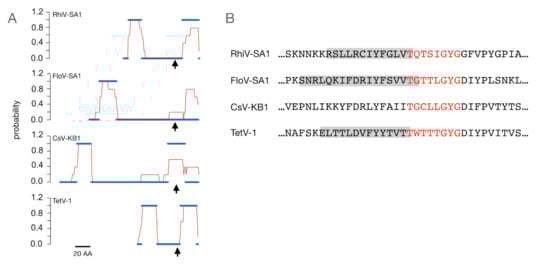 The same analysis conducted with all four mimivirid sequences shows a more diverse picture (Figure 4A). Based on TMHMM and the consensus results from four additional prediction programs, both TetV-1 and RhiV-SA1 are robustly predicted to have both transmembrane domain (TMD)1 and TMD2 in the expected positions. In FloV-SA1, all programs predict an upstream TMD1-like domain, but there is no consensus prediction of a TMD2. CsV-KB1 also has a predicted upstream TMD, but the predicted second TMD is in the wrong position with the selectivity filter in the center of the transmembrane helix. We then examined whether a structural prediction algorithm provides evidence for an α-helix region prior to the canonical filter motive of K+ channels (Figure 1 and Figure 4B). In a previous study on other viral K+ channels, the prediction of α-helices in this position was very robust []. The data show α-helices in the correct position in 3 of the 4 viral protein sequences; only CsV-KB1 lacked this structure.