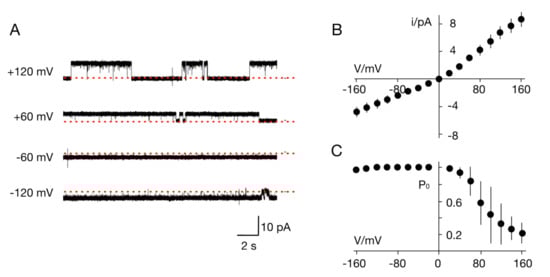 We then conducted a basic characterization of the TetV-1 K+ channel protein, named Ktv1 for K+ channel from Tetraselmis virus 1. The channel generated in a solution with 100 mM K+ on both sides of the membrane an asymmetric current/voltage (I/V) in which the conductance at positive voltages (57 ± 7 pS) was about 2 times larger than that a negative voltages (27 ± 5 pS) (Figure 5B). This value of unitary conductance is similar to that of other viral K+ channels []. The Ktv1 channel also exhibited an appreciable voltage dependency; it was nearly always open at negative voltages and exhibited increasingly long closed times at positive voltages (Figure 5A). The open probability/voltage (P0/V) plot shows that this results in a progressive decrease in channel activity with increasing positive voltages. If we assume that, like the other viral K+ channels, the Ktv1 channel inserts preferentially with the n- and c-terminus into the membrane [,], the low open probability at positive voltages would imply that the channel is an inward rectifier.