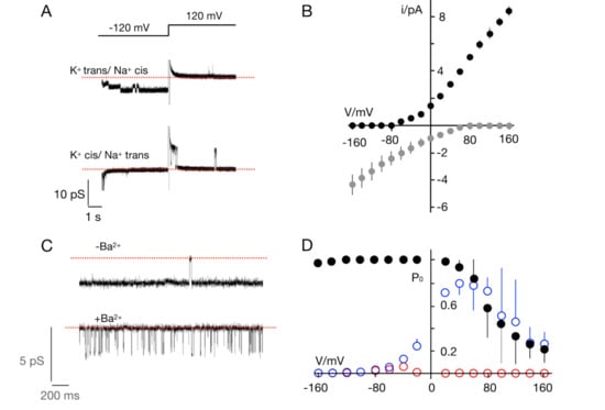 K+ channels are typically blocked by Ba2+ in a voltage dependent manner [,]. To test whether Ktv1 also exhibited this Ba2+ sensitivity, channel activity was recorded in 100 mM KCl and BaCl2 added at 5 mM first to the trans and then also to the cis chamber. The results indicate that the presence of the divalent cation on the trans side had no effect on the open channel amplitude (Figure 6C) but greatly reduced the open probability of the channel. The effect of the blocker is seen in Figure 6C: In the absence of the blocker the channel typically exhibits only short closures, while in its presence only short openings are seen. This mode of block and the voltage dependency of this effect, which increased with negative voltages (Figure 6D), is typical for the Ba2+ block of K+ channels []. Further addition of Ba2+ to the cis chamber resulted in a complete block of channel activity at positive voltages (Figure 6D). This effect is also typical for K+ channels in which Ba2+ blocks the channel with a higher affinity from the cytosolic than from the external side of the protein [].