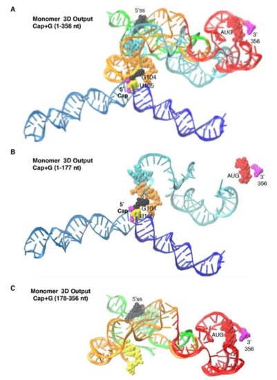 Monomer 3D model identified by SimRNA. (A) Most representative model of Monomer-prone 5′-UTR. (B) Focus on nt 1–177. (C) Focus on nt 178–356. Label colors designate: TAR, light blue; PolyA stem, navy; U5 stem, cyan; PBS, green; DIS stem and three-way junction, orange; 5′-Cap and 3′ terminus, magenta; G104, black; U105, yellow; AUG stem, red. 5′-splice site (5′ss), black; DIS, orange (A,B), yellow (C); gag start codon, red.