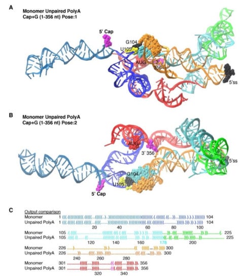 The SimRNA simulation of Monomer is changed by unpairing PolyA. (B) Two poses of the most representative SimRNA model of Monomer unpaired PolyA. (C) Vienna dot-bracket language comparison of differences between Input and Output constraints. The colored font designates: TAR, light blue; PolyA, navy; U5 stem, cyan; PBS-segment, green; DIS stem, orange; AUG stem, red; 5′-splice site (5′ss), black; nt of the 3-way junction, orange. Space filling atoms: 5′-Cap, white; G104, yellow, U105, black, AUG translation start codon, red (A,B) or magenta (C).