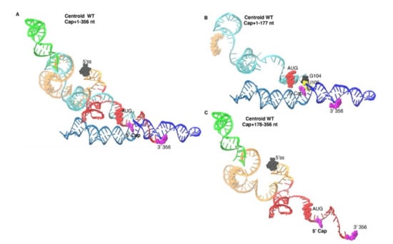 Centroid WT predicted TAR and PolyA arranged coaxial helices and base stacking interaction between Cap, G104-U105 (Figure 8A,B compared with Figure 4A,B). Unlike Dimer, the 5′ss was positioned at the apex of the stem loop formed by nt 280–300, as observed in Monomer (Figure 8A,C compared with Figure 4A,C). The U5 stem was an extended helix (nt 141–177 and 225–280) topped with PBS (green) (Figure 8A,C and Figure 9), similar to structural intermediates of HIV 5′-UTR dimerization [,,,].
