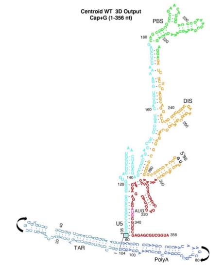 Ample secondary structure information is available on individual segments of the HIV 5′-UTR that are necessary for dimerization and packaging of diploid gRNA into virions [,,,,,,,,,,]. The dimer-prone secondary structure exhibits pairing of primary sequences of the unique 5′ region (U5) and AUG regions (U5-AUG model) [,]. U5-AUG pairing orients the dimer initiation sequence (DIS) for intermolecular dimerization and the core encapsidation signal (CES) for nucleocapsid binding, and packaging of the diploid genomic ribonucleoprotein into virions [].