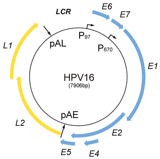 Schematic representation of human papillomavirus type 16 (HPV16) genome. The HPV16 genome is a circular double-stranded DNA molecule of eight kilobases. Blue cylinders represent HPV16 early genes (E1, E2, E4, E5, E6, and E7), and yellow cylinders represent HPV16 late genes (L1 and L2). HPV16 early and late promoters P97 and P670, respectively, and HPV16 early and late polyadenylation signals pAE and pAL, respectively, are indicated. The long control region (LCR) situated between the L1 stop codon and the E6 start codon contains the origin of DNA replication and the HPV16 early promoter/enhancer p97.