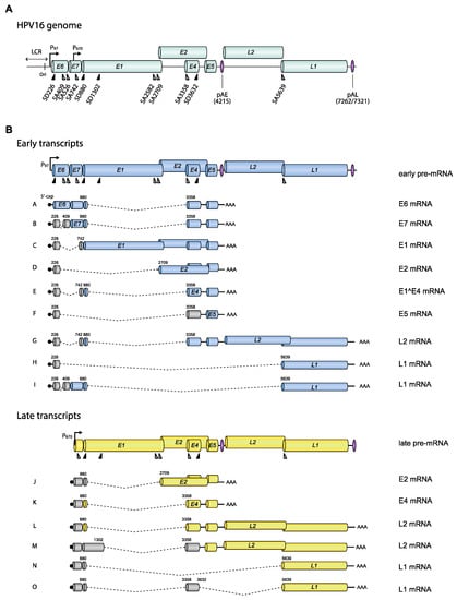 HPV is a small DNA virus with an approximately 8 kb circular, double-stranded DNA molecule as a genome [,] (Figure 1). The genomic structure is divided into three regions: Long control region (LCR), early gene region (E6, E7, E1, E2, E4, and E5), and late gene region (L2 and L1) (Figure 1 and Figure 2). The HPV LCR contains a replication origin (Ori) on which HPV replication factors E1 and E2 bind and initiate replication of the HPV DNA []. The HPV LCR also harbors the HPV early promoter, whereas the more elusive late promoter is located in protein-coding regions further down on the HPV genome. In addition to these two promoters, HPVs have two polyadenylation signals, named early (pAE) and late (pAL) polyadenylation signal (Figure 1). The early promoter and pAE are active during the early stage of the viral life cycle, whereas the late promoter and pAL are active at the late stage. Transcription from the early promoter normally terminates at the pAE, and transcription from the late promoter at the pAL, suggesting that there is one pre-mRNA species for early and one for late [] (Figure 2, “early pre-mRNA” and “late pre-mRNA”). However, it should be noted that many mRNAs initiated at the late promoter are polyadenylated at pAE (transcripts J and K) (Figure 2), and some mRNAs initiated at the early promoter are polyadenylated at pAL (transcripts G, H, and I) (Figure 2).
