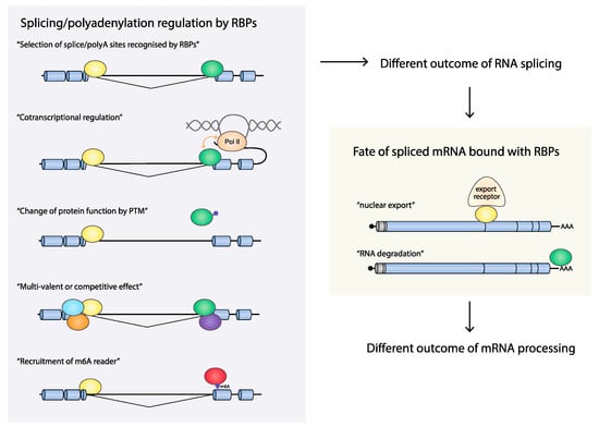 Consequences of RNA-binding proteins on the processing of mRNAs. (Left panel) pre-mRNAs are subject to alternative splicing and/or alternative polyadenylation controlled by interactions of the pre-mRNAs with cellular RBPs. These interactions result in the selection of appropriate splice sites or polyadenylation sites. The interactions between pre-mRNAs and RBPs can be modulated by (1) cotranscriptional regulation by altered by Pol II elongation kinetics or by interactions between Pol II and RBPs, (2) change of protein function by posttranslational modification (PTM), which is regulated by extracellular signaling and/or, for example, cellular responses to HPV infection, (3) multivalent effects and/or competition between RBPs that bind to the same or adjacent cis-acting regulatory RNA elements or hot spots for RNA-binding proteins, (4) m6A modifications on RNAs that affect recruitment of m6A readers that control RNA processing. (Right panel). Some of the RBPs may stick to the mRNAs after RNA splicing and polyadenylation. These RBPs may affect additional RNA processing steps subsequent to splicing, such as nuclear RNA export and RNA degradation.