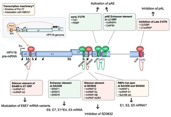 Regarding the HPV16 5′-UTR region, cellular RNA-binding proteins interacting with this region have not been identified to the best of our knowledge. However, cis-acting regions in the LCR interact with trans-acting transcription factors or DNA replication factors [,] that may affect HPV16 RNA processing. It has also been reported that there is a transcription initiation site upstream of the enhancer region in HPV16 LCR [], supporting the idea that proteins that bind the enhancer region (auxiliary enhancer: AE and keratinocyte enhancer: KE) in the LCR could potentially affect HPV16 RNA processing (discussed below) or translation. This may be an interesting area for future research.