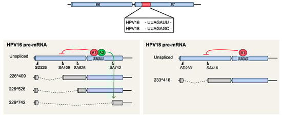 The control of these splice sites by cis-acting sequences and trans-acting factors is currently under investigation, and hitherto it has been reported that 226^409 splicing in HPV16 and the corresponding splicing event in HPV 18 (233^416) are negatively regulated by hnRNP A1 that binds to exonic splicing silencers located in the E7-coding region [,] (Figure 5). This suppression promotes production of unspliced E6 mRNAs at the expense of the spliced E7 mRNAs and highlights the importance of hnRNP A1 in the control of expression of the two oncogenes E6 and E7. In HPV16, hnRNP A2 interacts with the same splicing silencer to inhibit SA409 but is different from hnRNP A1 in that it redirects splicing to the downstream 3′-splice site SA742 [] (Figure 5). Thus, both hnRNP A1 and A2 inhibit splicing to SA409, but inhibition by hnRNP A1 promotes production of E6 mRNAs whereas hnRNP A2 does not. The cellular factors that antagonize hnRNP A1 and A2 to enhance splicing to SA409 in HPV16 or SA416 in HPV18, and thereby stimulate E7 mRNA production, are currently unknown.