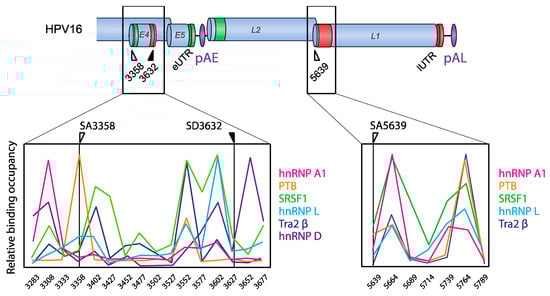 Hot spots for RNA-binding proteins (RBPs) at HPV16 splice sites SA3358, SD3632, and SA5639. Extensive mapping of protein interactions with HPV16 RNAs revealed the existence of hot spots for RNA-binding proteins (RBPs) on HPV16 mRNAs. These “RBP hot spots” were centered around HPV16 splice sites SA3358, SD3632, and SAA5639. Quantitations of the RNA–protein interactions and determination of relative binding occupancy of various RBPs (hnRNP A1, PTB, SRSF1, hnRNP L, Tra2B, and hnRNP D) at these hot spots are shown. The results shown here are adapted from [].
