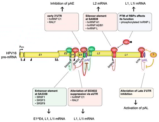 The HPV16 late polyA signal, pAL, is strongly suppressed by negative RNA elements located in the late UTR and that interact with U1snRNP and CUGBP [,,,], but other proteins have been reported to bind to the UTR as well (Figure 7) []. The negative regulatory effect of the late UTR is a conserved property of many HPVs, although it appears that the HPV16 late UTR is particularly inhibitory []. Apparently, the suppression of the HPV16 pAL is an important property of HPV16 that probably contributes to the strong suppression of HPV16 late gene expression at the early stage of the HPV16 life cycle.