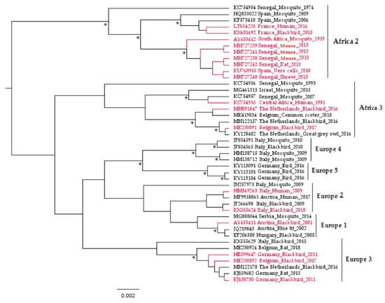 Phylogenetic tree representing the placement of Usutu virus (USUV) strains used to infect experimental models in vitro and in vivo based on partial non-structural 5 genes. The asterisks (*) indicate a support value from Bayesian posterior probabilities >70%. To improve visualization, Africa 1 lineage (KC754958 Central African Republic_Mosquito_1969) is not represented in the figure, and phylogenetic positions of USUV experimentally used in the laboratory are red-colored. Taxon information includes the GenBank accession number, country, and host in which the virus was detected and detection year. The scale bar indicates the mean number of nucleotide substitutions per site.