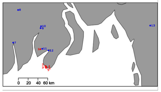 Map of the southern Bangladesh coastline (sea in white, land in grey) with sampling site locations. Hatcheries denoted with a red diamond (1–6) and river sampling sites denoted with blue diamond (7: Shibsa River, 8: Rupsa River, 9: Katcha River, 10: Kocha River, 11: Biskhali River, 12: Payra River, 13: Karnaphuli River).