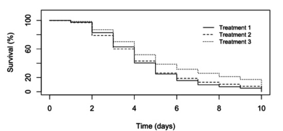 At the end of the 10-day disease challenge, mortalities exceeding 80% had occurred in all three experimental groups, including larvae exposed to an extract produced from a hatchery that at the time had not experienced mortalities (Figure 2). However, it was later discovered that the healthy hatchery experienced mass mortalities to a similar level of other hatcheries in the south of Bangladesh shortly after they were sampled for the experimental material. As the challenge progressed, reduction in swimming ability, feeding and growth were observed in all treatments. Moribund larvae appeared white in colour compared to healthy larvae.
