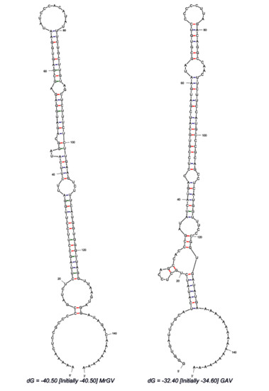 RNA secondary structure predicted using MFOLD of 3′ UTR sequences of MrGV and GAV downstream of the stop codon of the final 3′ ORF.
