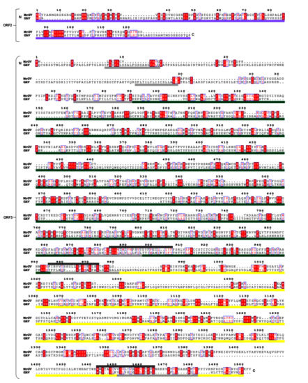 Sequence alignment of MrGV and GAV 3′ UTRs. Residue numbering based on the start codon of MrGV ORFs. ORF2 of GAV encodes the p20 nucleoprotein (purple bar). ORF3 of GAV encodes the gp116 glycoprotein (green bar) and gp64 glycoprotein (yellow bar). Transmembrane regions of GAV are shown as light grey bars and TMHMM-predicted transmembrane regions of MrGV are shown are dark grey bars. Residues in red boxes are conserved and residues in blue boxes have >0.7 Global Similarity Score based on physio-chemical similarities in ESPript3.