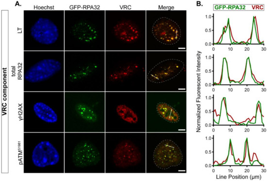 To determine if GFP-RPA32- and GFP-NLS-expressing cells were permissive for MuPyV infection, we assessed the expression of the viral proteins LT and VP1 across a range of MOIs and found that the cell lines were comparably infectible (Figure S1F). To confirm that GFP-RPA32 relocalized to VRCs, we immunolabeled known VRC components in the GFP-RPA32-expressing cells (Figure 2A,B) [5,6,7,23]. We found that GFP-RPA32 colocalized with both LT and total RPA32 (endogenous and GFP-RPA32), as well as γH2AX, a phosphorylated histone associated with DNA damage sites. Phosphorylated ATM (pATMS1981), an activated upstream kinase in the DDR, also colocalized with GFP-RPA32 at VRCs. These data confirmed that GFP-RPA32 colocalized with VRCs in MuPyV-infected cells.