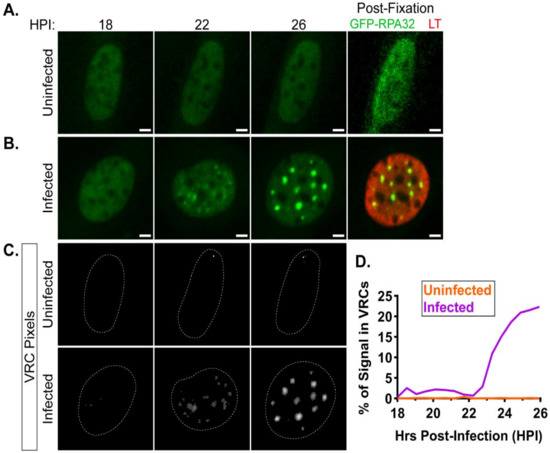 VRC dynamics during live cell microscopy. GFP-RPA32-expressing cells were infected for 18 h and then imaged every 10 min from 18–26 h post-infection (HPI). At 26 HPI, cells were fixed and processed for immunofluorescence microscopy of LT. Representative (A) uninfected (LT-negative) and (B) infected (LT-positive) cells at 18, 22, and 26 HPI, as well as post-fixation (GFP-RPA32 = green, LT = red). Scale bar = 5 μm. (C) Focal pixels were identified for each frame in (A,B) based on GFP-RPA32 signal. Pixels with intensity values > 1.5× higher than the mean signal intensity of a single nucleus within each frame were defined as “VRC pixels.” The dotted white line in each image denotes the nuclear border (Figure S2A). (D) The integrated signal density of VRC-associated pixels was divided by the integrated signal density of the whole nucleus to calculate “% of Signal in VRCs” values. The % of Signal in VRCs values are shown for the uninfected (orange trace) and infected (violet trace) cells shown in (A) and (B), respectively, between 18–26 HPI.