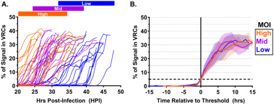 To reduce this variability, we aligned the data points for each cell (the “cell trace”) to a common threshold (Figure 4B), as described in the Methods. Interestingly, aligning individual cell traces significantly reduced the variability of VRC formation kinetics within and between conditions. Furthermore, we did not detect any significant effect of MOI on the maximum percentage of GFP-RPA32 signal associated with VRCs (30–35%), nor the rate of GFP-RPA32 relocalization during VRC expansion. The number of VRCs per nucleus during VRC formation was also similar between MOIs (19–20 ± 6 in each condition). These results suggest that MOI affects the timing of VRC formation but does not affect the kinetics of VRC expansion or the number of VRCs observed during VRC formation.