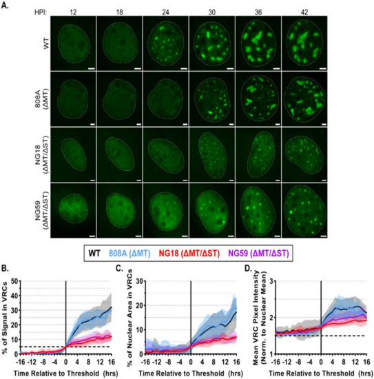 To investigate further the relocalization of GFP-RPA32 during these infections, we quantified the area and relative signal intensities of VRC pixels over time. Consistent with our observations of the time course images, we found that VRCs in NG18- and NG59-infected cells occupied a smaller proportion of the nuclear area than did VRCs in WT- or 808A-infected cells (5–10% and 15–20%, respectively) (Figure 5C). The intensity of GFP-RPA32 signal in VRC pixels was normalized to the mean nuclear signal and used to estimate the relative density of VRC-associated RPA. We found that, after their formation, NG18 and NG59 VRCs tended to be dimmer (i.e., less dense) than WT and 808A VRCs (1.75–2.25× and 2.00–2.50× brighter than their nuclear means, respectively), suggesting there may be less vDNA-associated RPA at NG18 and NG59 VRCs (Figure 5D). These quantitative analyses are consistent with qualitative observations from fixed cells and suggest that ST, but not MT, is required for VRC expansion, likely reflecting the reduction of vDNA accumulation during NG18 and NG59 infections [6,7,20,35].