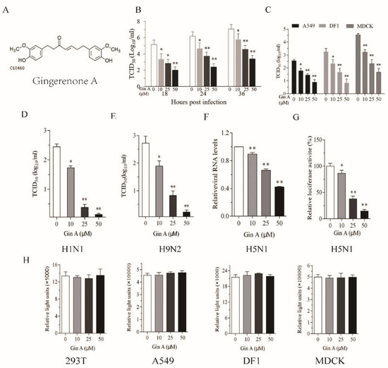 To determine the effect of Gin A on virus growth, four cell lines (293T, A549, MDCK, and DF1) were infected with 0.01 multiplicity of infection (MOI) of H1N1, H5N1, or H9N2 virus and then incubated in the presence of various concentrations of Gin A (0, 10, 25, 50 μM). For H1N1 and H9N2 virus infection, tosyl-phenylalanyl-chloromethyl-ketone-treated trypsin (Sigma, St. Louis, MO, USA) (2 μg/mL) was added into the media during and after virus infection. The conditioned media were collected at 18, 24, or 36 hours post-infection (hpi). The TCID50 values were determined on MDCK cells according to our previous publications [20]. Data represent the mean ± standard deviation (SD) of four independent experiments.