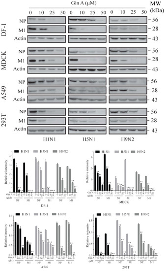 Gin A decreases viral protein levels. The DF-1, MDCK, A549, and 293T cells infected with the H1N1, H5N1, or H9N2 virus (0.1 MOI each) were incubated in the absence or presence of the indicated concentrations of Gin A for 8 h. Cell lysates were prepared and analyzed for NP and M1 expression by Western blot with their specific antibodies. Actin was detected as the loading control. The density of the viral protein bands was analyzed by using NIH Image-J software and normalized by the arbitrary units of β-actin. MW, molecular weight. * p < 0.05, ** p < 0.01, compared to the untreated control.
