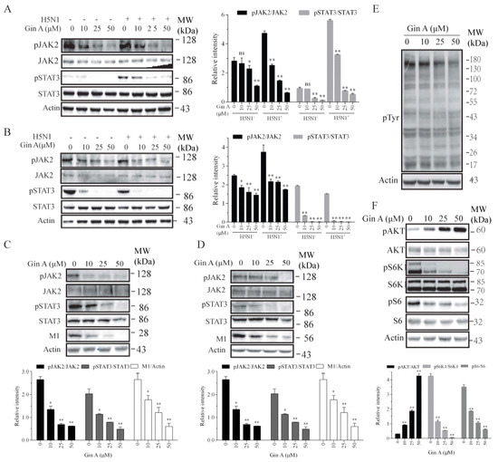 Gin A inhibits JAK2 and STAT3 tyrosine phosphorylation and S6K1 activity. The 293T cells were pretreated with the indicated concentrations of Gin A for 2 h. The cells were then infected with the H5N1 virus (1 MOI) at 4 °C for 2 h in the absence or presence of the same concentrations of Gin A. After removing the cells with warm PBS, the cells were incubated at 37 °C for 30 min in the absence or presence of the same concentrations of Gin A. The cell lysates were prepared and analyzed for JAK2 and STAT3 phosphorylation (A). (B–F) The 293T cells infected with H5N1 (B,E,F), H1N1 (C), or H9N2 (D) virus were incubated in the absence or presence of the indicated concentrations of Gin A for 8 h. Cell lysates were prepared and analyzed for JAK2 and STAT3 tyrosine phosphorylation and the levels of M1 expression by Western blot (B–D), for total protein tyrosine phosphorylation (E), and for the levels of protein phosphorylation in the PI-3 kinase pathway (F). Actin was detected as loading controls. The density of the phosphorylated JAK2 and STAT3 bands was analyzed by using NIH Image-J software and normalized by the arbitrary units of their corresponding total proteins. * p < 0.05, ** p < 0.01, compared to the untreated control.