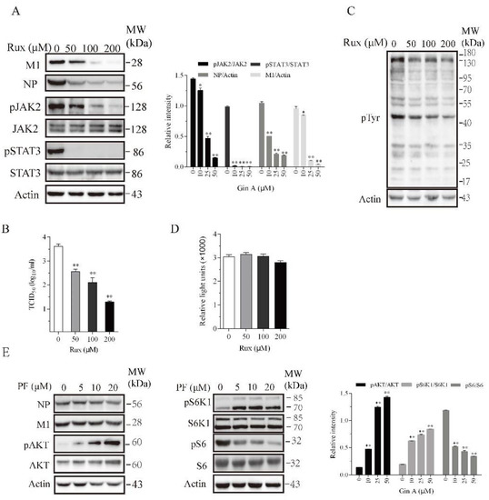 Recent studies have shown that JAK1 and JAK2 play important roles in IAV replication [14,28,29]. We hypothesized that Gin A may inhibit IAV replication by inhibiting JAK2 activity. We investigated if Ruxolitinib (Rux), a JAK inhibitor, also inhibited IAV replication. Ruxdose dependently reduced the levels of the M1 and NP proteins (Figure 4A) in the lysates of 293T cells infected with the H5N1 virus and decreased the virus titers in the conditioned media (Figure 4B). Rux dose-dependently inhibited JAK2 tyrosine phosphorylation and dramatically inhibited the phosphorylation of its substrate STAT3 (Figure 4A). Western blot analysis with an anti-pTyr (P-Y-1000) revealed that Rux inhibited the total protein tyrosine phosphorylation (Figure 4C). The 293T cells incubated in the presence of the indicated concentrations of Rux for 12 h did not exhibit any significant cytotoxicity or retarded cell growth (Figure 4D).