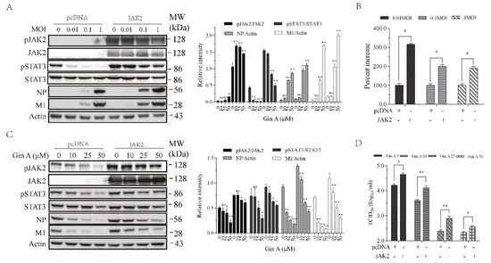 3.5. JAK2 Overexpression Enhances IAV Replication and Attenuates Gin A-Mediated Antiviral Activity