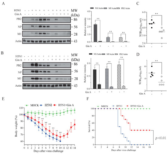 The use of animals was approved by the Institutional Animal Care and Use Committee of the College of Veterinary Medicine, Yangzhou University. Female C57BL/6 mice were purchased from the Center of Experimental Animals of the College of Veterinary Medicine, Yangzhou University. All mice were maintained on a 12 h light/dark cycle and housed in ventilated cages at an ambient temperature of 23 °C. Mice were fed ad libitum on a normal chow diet (NCD). Gin A was first dissolved in dimethyl sulfoxide (DMSO) and then diluted in polyethylene glycol (PEG) 200 (Tokyo Chemical Industry, Inc., Tokyo, Japan). Mice (8 weeks old) (5 mice per group) were treated with Gin A (20 mg/kg/day) by gavage. Twelve hours after the first treatment, mice under diethyl ether anesthesia were intranasally mock-infected with PBS or infected with the H5N1 virus (1 × 105 pfu in 50 μL PBS) by instillation. The H5N1 virus is a moderately pathogenic strain in mice. The dose was determined based on a previous publication from our group [23]. Mice were then treated with the same dose daily for three or five days. Mice were sacrificed by CO2 inhalation. Lung tissues were homogenized in a radioimmunoprecipitation assay (RIPA) lysis buffer (Cell Signaling Technology, Danvers, MA, USA) for Western blot or in PBS for analyzing virus loads. To determine the therapeutic effect of Gin A, mice (10 mice per group) infected with H5N1 virus were treated daily with Gin A (5 mg/kg body weight in 20 μL PEG 200) by intranasal instillation for 7 days. To avoid physical irritation caused by gavage and poor drug absorbance in the gastrointestinal tract of the H5N1 virus-infected mice, Gin A was given intranasally at a low dose in this experiment, since the drug, administered this way, directly goes to the lung where the virus replicates. Mice in control groups were treated with PEG 200. Mice were monitored daily for body weights and survival for 2–3 weeks and were humanely sacrificed by CO2 inhalation when they became moribund or when the loss of body weight decreased by >25%. The body weights of a small fraction of mice dropped beyond 25% in the last day before they were sacrificed. The last-day data of these mice were not included.