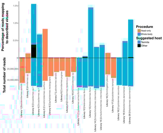 Due to the small sample size and the confounding country and procedure variables (i.e., all whole-body samples were collected in Australia), we could not determine if there was a relationship between virome structure and diet or country. Visual inspection revealed no obvious association between termite phylogeny and virus composition and abundance, aside from members of the same species sharing similar viromes (Figure 9). Notably, however, the sampling procedure (i.e., whole-body or head-only with poly(A)+ enrichment) used to produce each library had a significant impact on virome composition, with virome abundance (R2 = 0.33, p = 0.00865), richness (R2 = 0.61, p = 4.27 × 10−5) and diversity (R2 = 0.44, p = 0.00144) differing significantly by sampling procedure (Figure 1). Libraries prepared from whole-body samples also had a greater number of reads mapping to RNA viruses: 0.6% of total reads mapping to RNA viruses in whole-body libraries compared to 0.1% in head-only libraries.