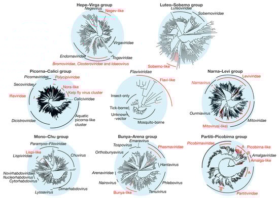 Overall phylogenetic trees representing each of the nine groups of RNA viruses (Table 2). Phylogenies were inferred using the gene encoding the RdRp, with the virus taxa (usually genera) identified in this study shown in red. Taxonomic groups of interest are labeled on the trees for reference. The sequence alignments used to infer the individual phylogenies are described in Supplementary Table S3. All trees are unrooted with branch length scaled to the number of amino acid substitutions per site.