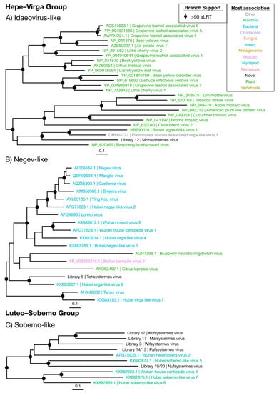 Phylogenetic trees of the viruses newly discovered here and their relatives in the Hepe–Virga and Luteo–Sobemo groups. Newly identified viruses are labeled with black text in the format “<Library #|Virus name>”, while related viruses are colored by their host association and are labeled in the format “<Replicase protein accession>|<Virus name>”. Black dots at tree nodes indicate high branch support (aLRT > 90).