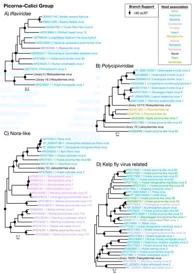 Phylogenetic trees of the viruses newly discovered here and their relatives in the Picorna–Calici group. Newly identified viruses are labeled with black text in the format “<Library #|Virus name>”, while related viruses are colored by their host association and are labeled in the format “<Replicase protein accession>|<Virus name>”. Black dots at tree nodes indicate high branch support (aLRT > 90).