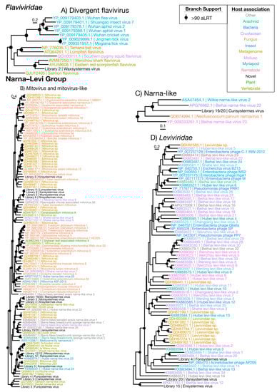 Phylogenetic trees of the viruses newly discovered here and their relatives in the Flaviviridae and the Narna–Levi group. Newly identified viruses are labeled with black text in the format “<Library #|Virus name>”, while related viruses are colored by their host association and are labeled in the format “<Replicase protein accession>|<Virus name>”. Black dots at tree nodes indicate high branch support (aLRT > 90).