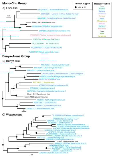 Phylogenetic trees of the viruses newly discovered here and their relatives in the Mono–Chu and Bunya–Arena groups. Newly identified viruses are labeled with black text in the format “<Library #|Virus name>”, while related viruses are colored by their host association and are labeled in the format “<Replicase protein accession>|<Virus name>”. Black dots at tree nodes indicate high branch support (aLRT > 90).