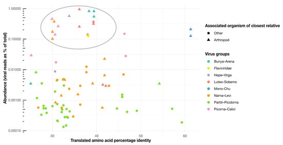 Abundance scatterplot for the novel viruses identified here. Each virus is represented by a single point, with the color indicating the taxonomic group the virus belongs to and the shape indicating the host organism of the closest virus relative (arthropod hosts are shown as triangles). The y-axis depicts the log abundance of the viruses, while the x-axis shows the translated amino acid percentage identity for each virus from their closest relatives. The gray circle indicates a cluster of viruses in relatively high abundance (generalized linear model, df = 81, p = 2 × 10−16) and closest relatives that commonly have arthropod associations (Pearson’s Chi-sq, df = 81, p = 4.6 × 10−6).