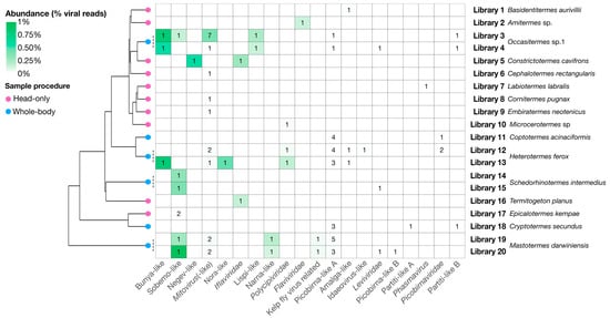 Heatmap showing number of virus genomes and their relative abundance in each library. Virus clades are shown on the x-axis by decreasing total abundance, libraries are given on the right y-axis ordered by the phylogenetic relationships of the termites in each library. The abundance, as a percentage of the total reads, of each genome is presented as a heat map while the number of genomes found for each group is labeled for each cell. The schematic phylogenetic tree on the left is adapted from Bucek et al. [7] and represents phylogenetic relationships between termites associated with each library. Tip nodes on this tree are colored by procedure used to collect termites and process them to libraries: Blue nodes represent the “whole-body” procedure, while pink nodes represent the “head-only” procedure.